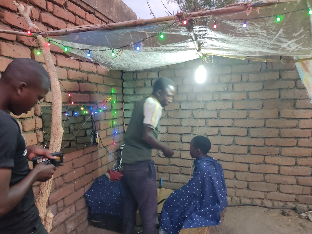 Bakili's solar charger is done and powering local business like barber shops and makeshift theaters!